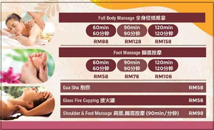 服务价钱:1小时RM88,1.5小时RM128,2小时RM158;脚底按摩1小时RM58,1.5小时RM78,2小时RM108,刮痧RM58,拔罐RM58